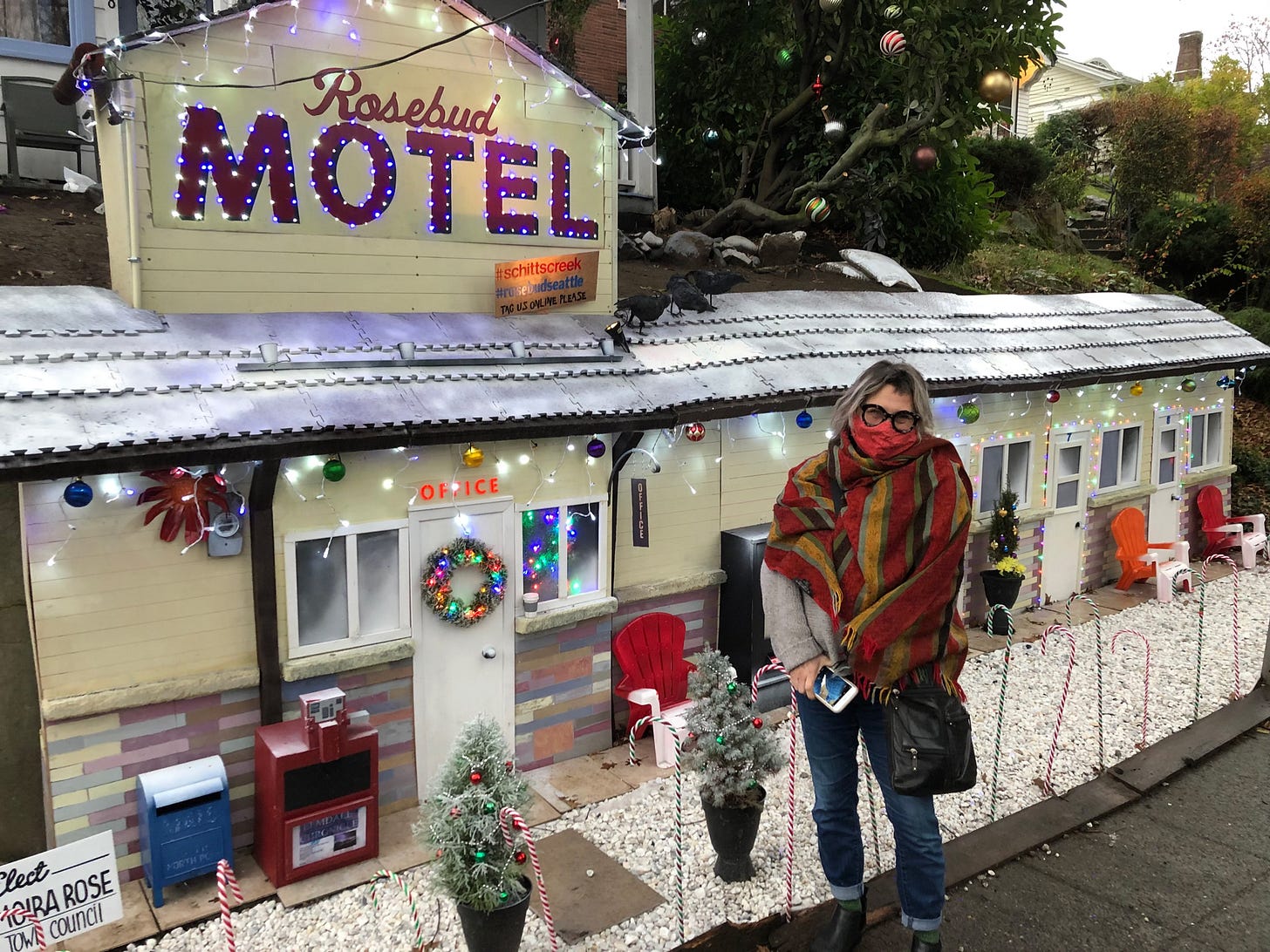 In many respects I think the Pandemic and lock down uncovered a creative streak in people. Such was the case when word spread throughout Seattle about a generous homeowner who during the very strange 2020 holiday season spent countless hours transforming a concrete retaining wall along the sidewalk into a whimsical and remarkably detailed installation of the Rosebud Motel decked out for Christmas.