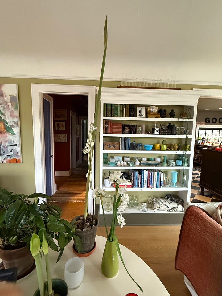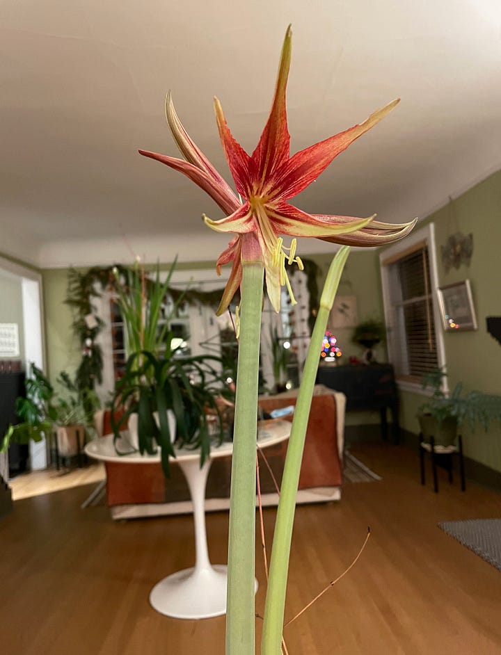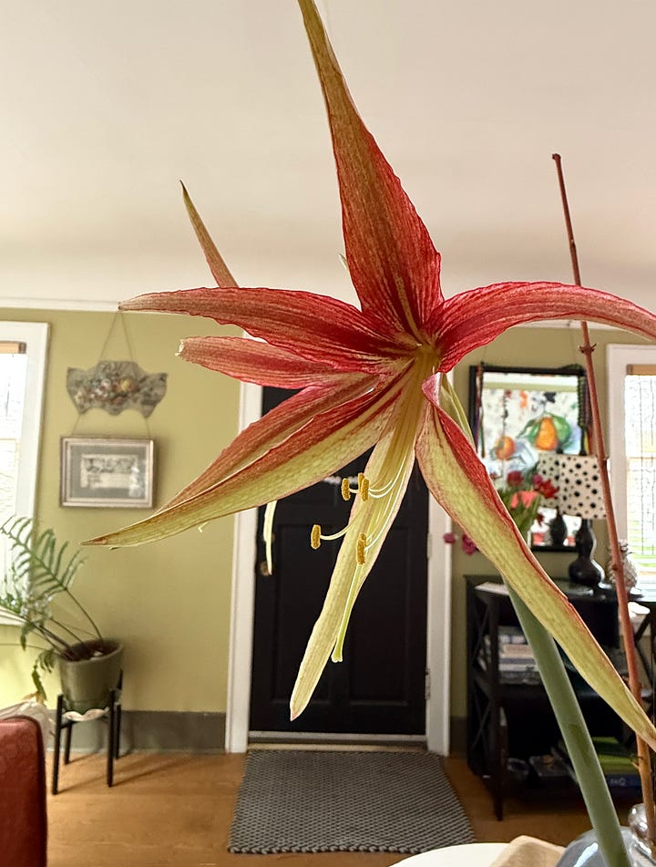 My favorite new amaryllis added to my collection this year is ‘Belladona’ (above left) a miniature form enthusiastically blooming with coral blooms. I planted 3 bulbs in a small 8-inch terracotta pot. Above right is an old soul in my collection. It may be hard to see but if you follow the narrow stem from the grey pot to beyond the top of the frame you’ll see ‘la Paz’. When I recently measured it the stem was 3+-feet tall. Today the bud is cracking so I’m looking forward to her return. Paz means PEACE, which seems appropriate to hold in my heart given my country’s administration’s attack on Venezuela.