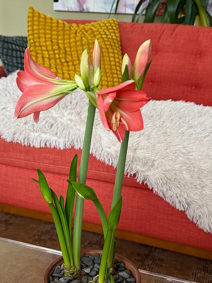 Love seeing the blooming amaryllis. Your post last year prompted me to buy bulbs last fall. Even though they got a late start, one is blooming now with another hopefully by February. They are a welcome display during these dark days of winter. Thank you for sharing the ongoing beauty of nature.