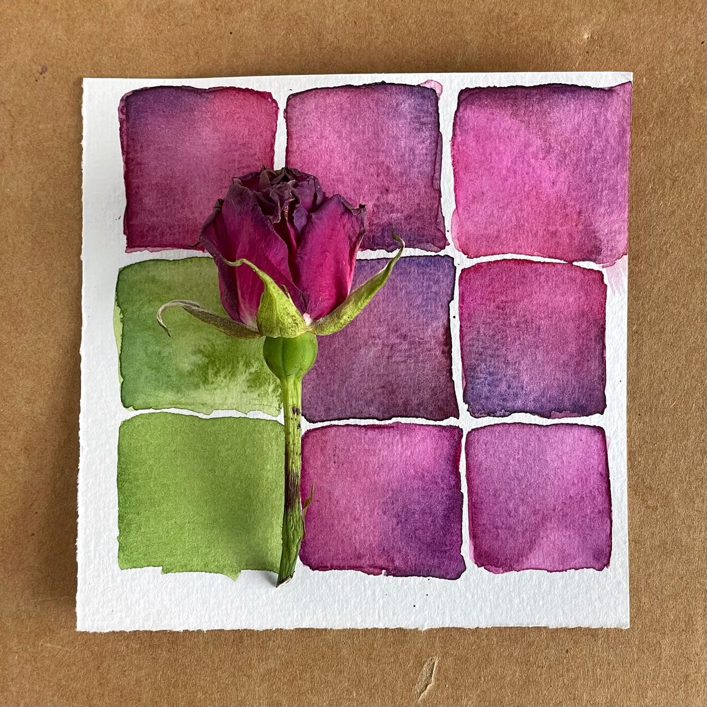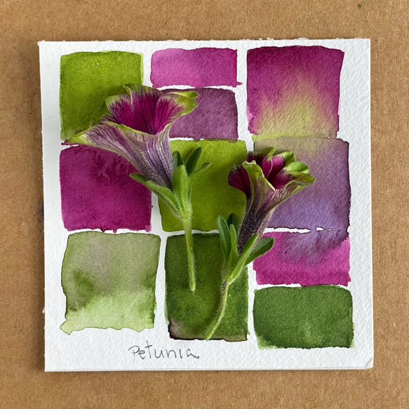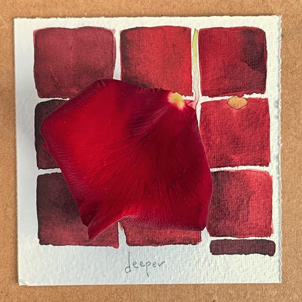 A couple of years ago I began to break up the customary grid of my daily color study — somebody referred to them as my “rough edges.” That felt right — we’ve all got rough edges, why not celebrate them. However, recently whenever I depart from the grid, I feel unsettled. It’s a physical reaction, almost fearful, way outside my comfort zone. And so I retreat to the familiarity of a grid.