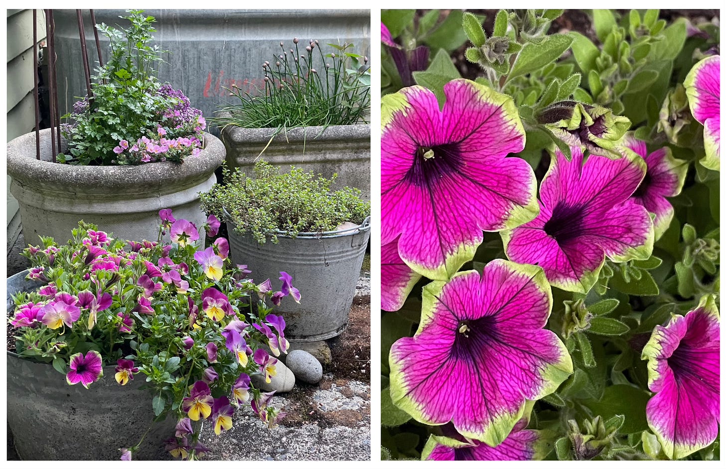 Summer stoop styling, and by ‘styling’ I mean ‘buying plants.’ This year’s display on the back stoop is brought to you by uncommon shades of fuchsia, pink, lavender, orchid and related hues. Don’t you just love it when colors are named for plants — or is it the other way around?