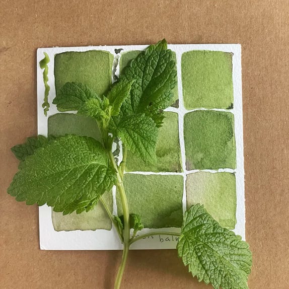 A much coddled sprig of lemon balm brought home from my daughter’s garden so that I could paint its portrait.