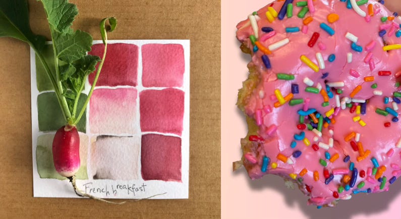 Forget, even if just for a moment, what you think you see. A red rose, a green leaf, even a humble radish — or a pink doughnut with sprinkles — contains myriad subtleties. There’s a delightful feedback loop to recording color, the more we look the more we see.