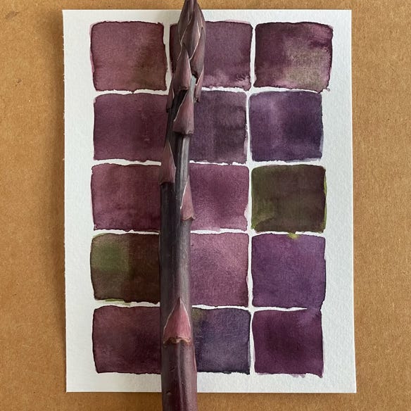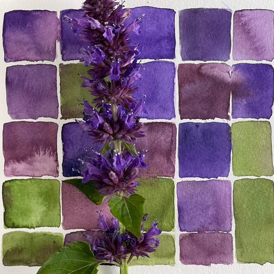 Look beyond the primary color, in this case violet blue, to find the hidden hues, like that dull pinkish brown or puce. Including secondary, not necessarily pretty colors paints a more true portrait of the plant.