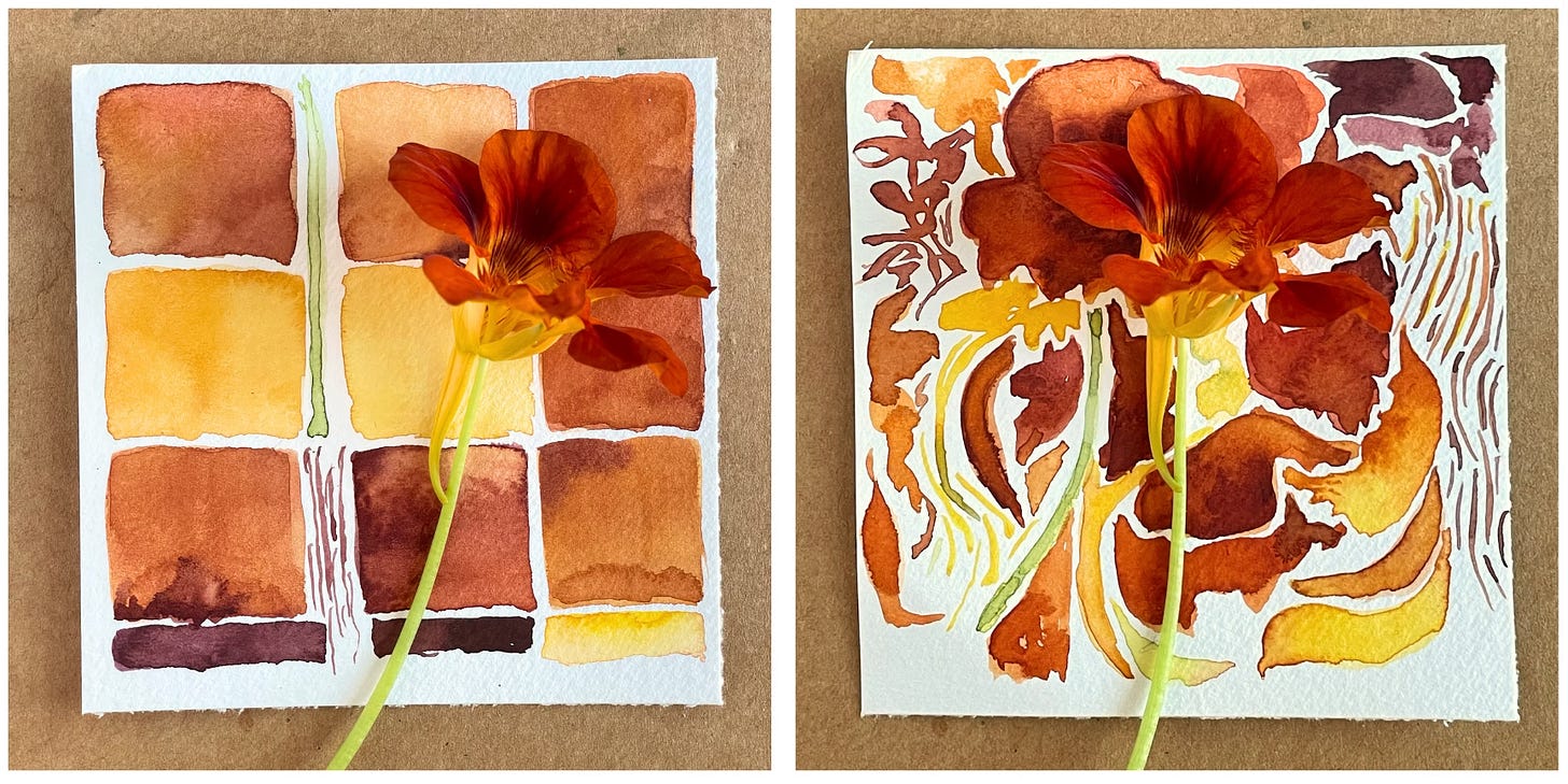 Returning to a non-grid color study from the distance of a few days is completely different, and far less threatening. Why oh why do I feel “threatened” by this shift. I think we can all agree, change is challenging. Maybe this is practice for moving into the next.