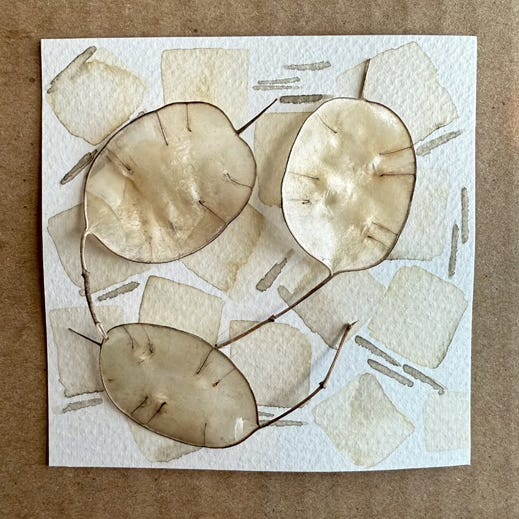 Last fall a friend gave me a dried bouquet with sprigs of Lunaria annua in it — a perfectly lovely names that belies the plant’s weedy takeover tendencies. I tucked the stems into a juniper garland on the mantle where their pearlescent seedpods glowed by candlelight.