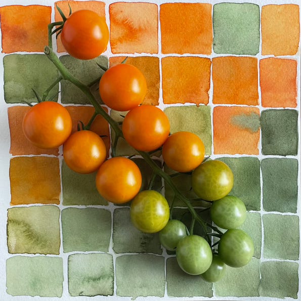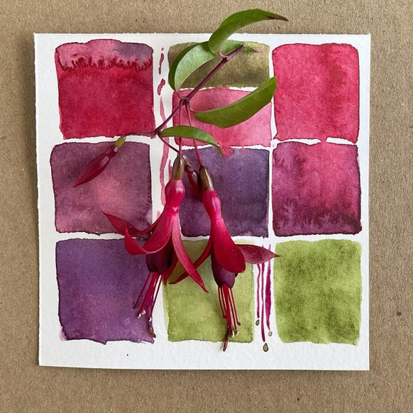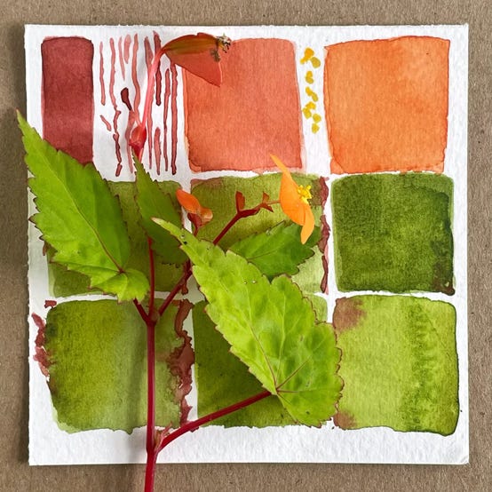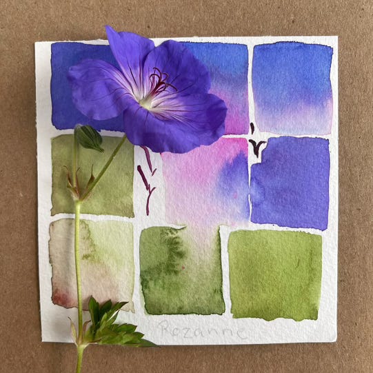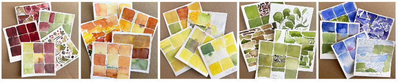 Color stories: For more than 6 1/2 years I’ve been creating color studies, simple watercolor grids (or not) on small sheets of watercolor paper. In my heart I am a storyteller, so I decided to call these color stories. Each color story is a collection of nine original 4- by 4-inch watercolor paintings assembled in a unique color palette. That is, each one relates to the others in the set. Some of these color studies are several years old, others may be as recent as last week. These are not precious paintings; they are colorful remnants of my daily practice.