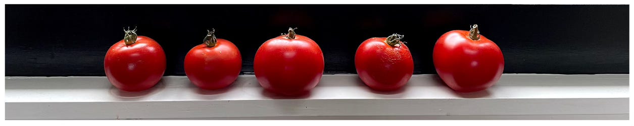 The countdown to our family celebration is accelerating, time is flying. So the time seems ripe to repost an essay I wrote last winter about transitions and tomatoes.